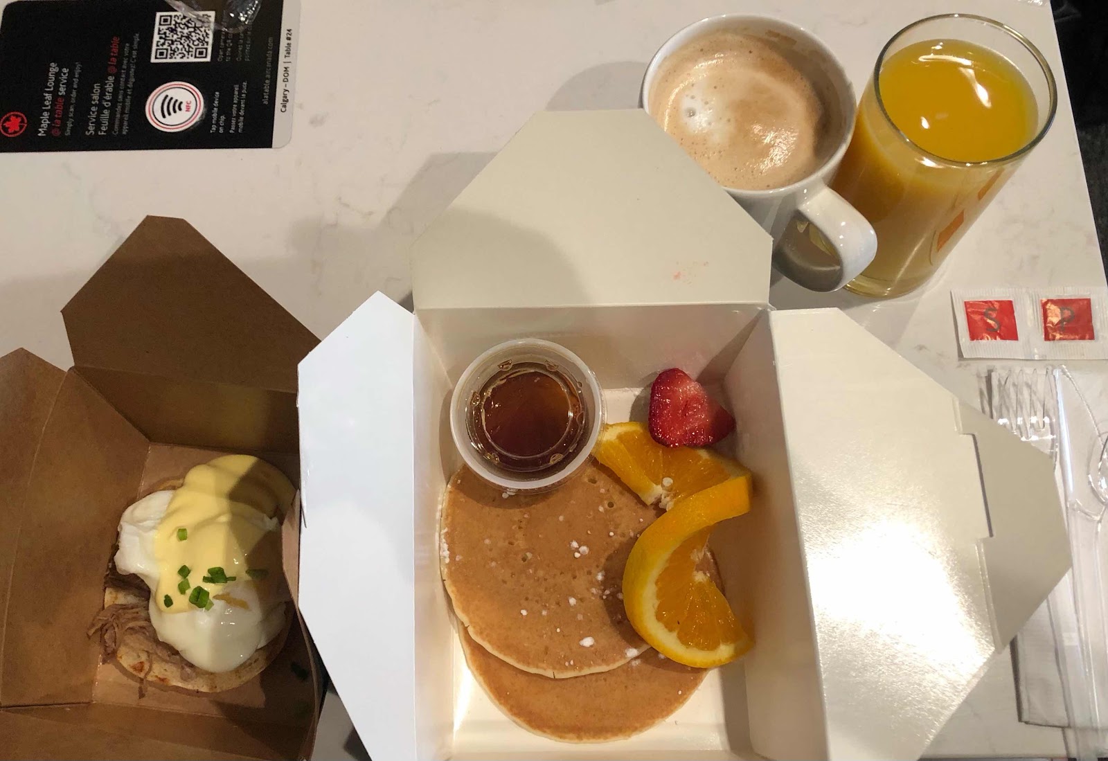 Just to show how the airport lounge experience has changed due to Covid: at least in the Air Canada Maple Leaf Lounges, the ol’ buffet has been replaced by a table-specific barcode: scan it with your phone, select what you want, and it’s delivered to your table. One food item per box. Ouff, the waste this system is producing is scandalous.