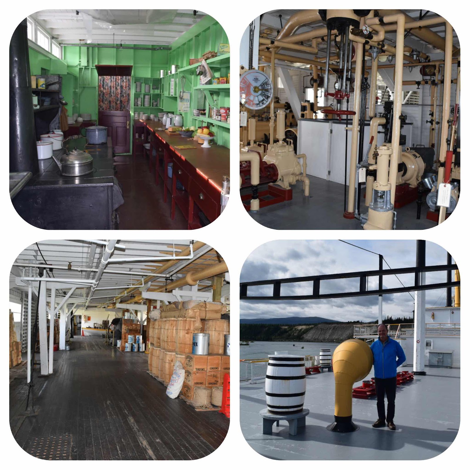 Interior scenes from the SS Klondike, including the kitchen, engine room and freight area, as well as the upper deck.