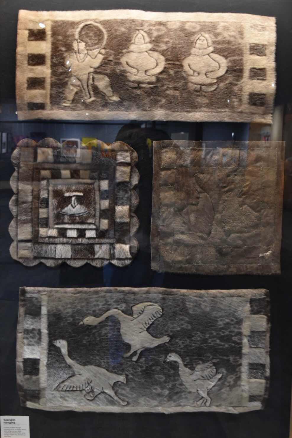 Sealskin art at the MacBride Museum. The shades of grey are made by cutting the seal pelts to different depths.